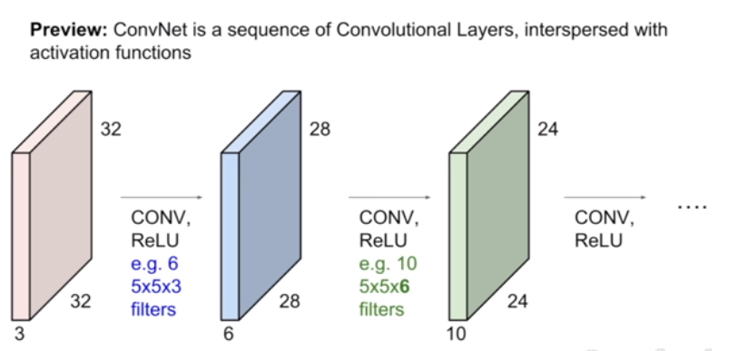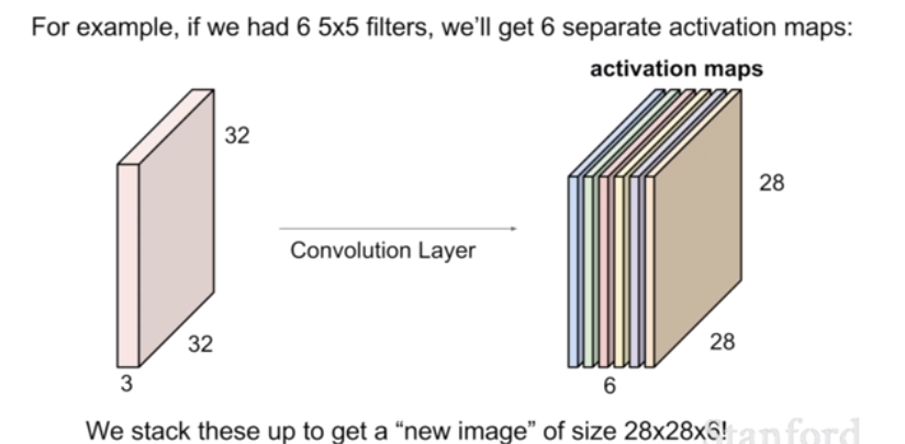 만약 filter를 여러 개 사용하게 된다면 filter의 개수만큼 activation map이 형성될 것이다. 이렇게 Conv layer를 쌓아나가면서 CNN을 완성시킨다. 그렇다면 아래의 문제를 풀어보자.