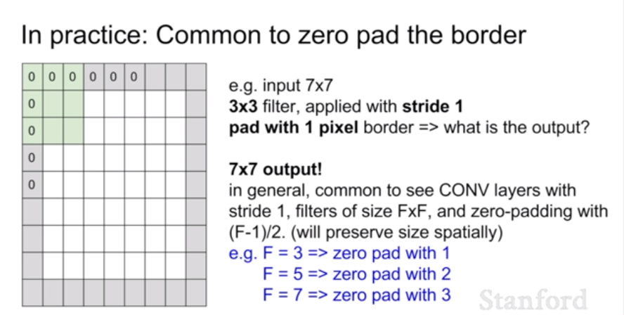 Conv Layer를 통과하면서 spatial 크기를 그대로 유지하게 해준다는 점 이외에도, 패딩을 쓰면 성능도 향상된다. 만약 제로 패딩을 하지 않고 valid convolution을 한다면 볼륨의 크기는 Conv Layer를 거칠 때마다 줄어들게 되고, 가장자리의 정보들이 빠르게 사라지게 될 것이다.