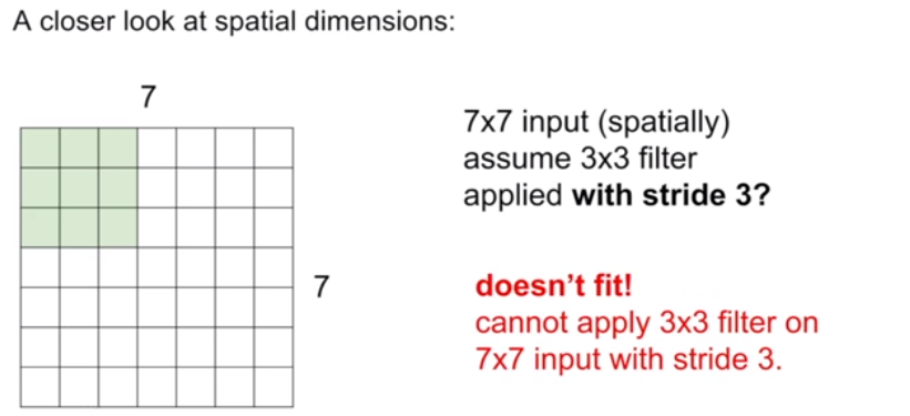 이렇게 stride에 따라 output size는 오른쪽의 공식에 따라 계산할 수 있다. stride 값이 커질수록 output size는 작아진다. 사실 당연한 말이다. filter를 통해 계산한 값인 activation map의 크기가 작아질 수밖에 없기 때문이다.