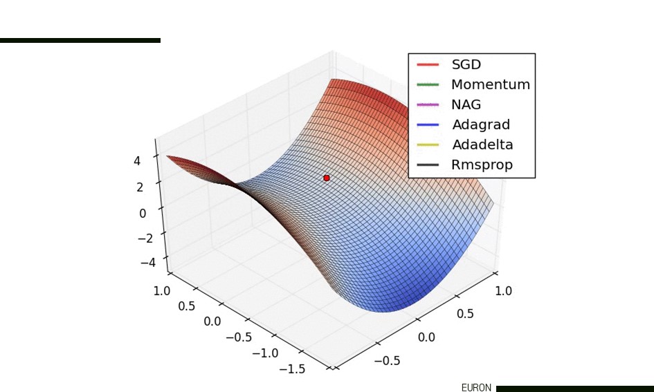 이러한 특징 덕분에 위에서 SGD의 한계점으로 언급되었던 local minima나 saddle point에서 gradient가 0에 수렴하는 값을 가진다 하더라도 이전 step들에서 축적되어온 v값이 더해지며 멈추지 않고 그 지점을 통과할 수 있게 되는 것이죠. local minima에서 gradient가 0이 되더라도, 그 지점에서 속도를 여전히 갖고 있을테니까요. Saddle point에서도 그 주변 기울기는 매우 작을 수 있으나, 그 지점까지 가는데 발생한 속도 벡터가 존재하면 그 지점을 계속해서 통과해서 아래로 나아갈 수 있게 되는 것이죠.