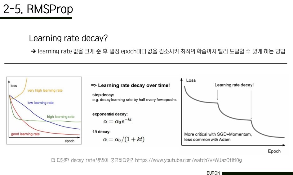 방금 나왔던 decay rate에 대해서 조금 더 살펴보도록 하겠습니다. Learning rate decay란 learning rate 값을 크게 준 후에 일정 epoch마다 값을 감소시켜 최적의 학습까지 빠르게 도달할 수 있도록 하는 방법입니다. 실제로는 학습이 수행될수록 loss값의 감소가 더뎌지기 때문에 learning rate를 줄여나가는 것이 꼭 필요하다고 해요. 이걸 수행하는 방법은 여러 개가 있는데요, 수업에서 소개되었던 exponential decay도 있고, 오른쪽 그림처럼 감소가 더뎌질 때마다 learning rate를 줄여주는 step decay 방법도 있습니다. Learning rate decay는 처음부터 쓰는 것이 아니고, 학습 과정을 모니터링 한 후에 학습이 더딘 지점 등 필요하다고 판단되는 지점에 사용하게 됩니다. 더 다양한 decay 방법이 궁금하신 분은 아래 링크를 참조해보셔도 좋을 것 같아요.