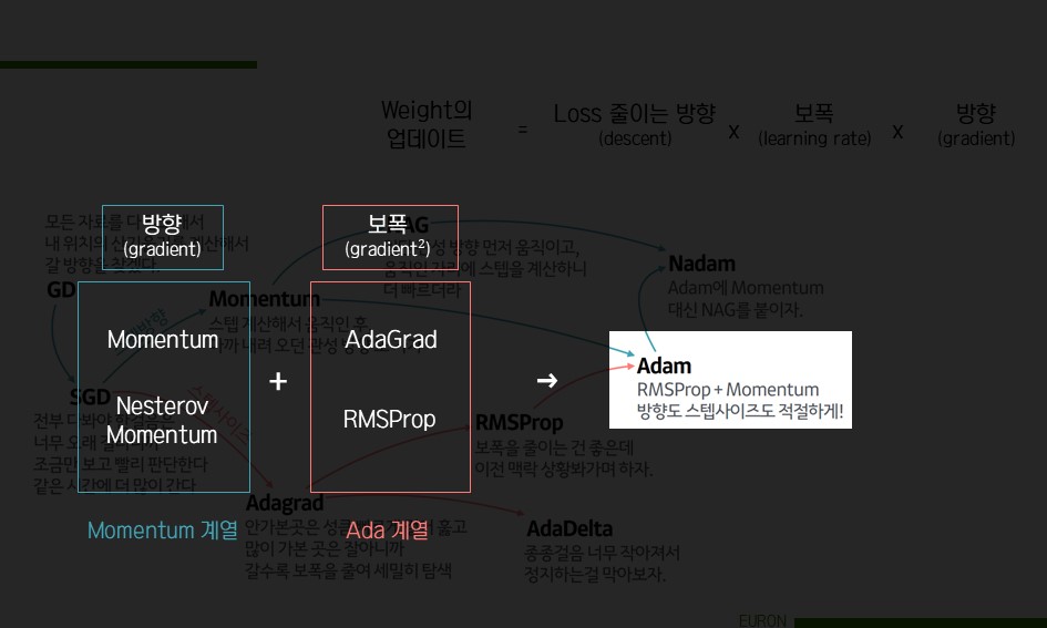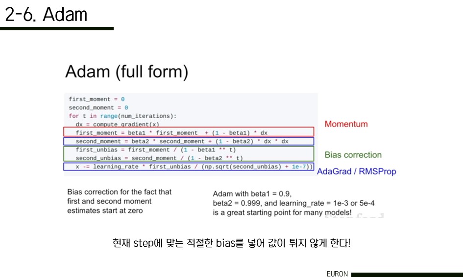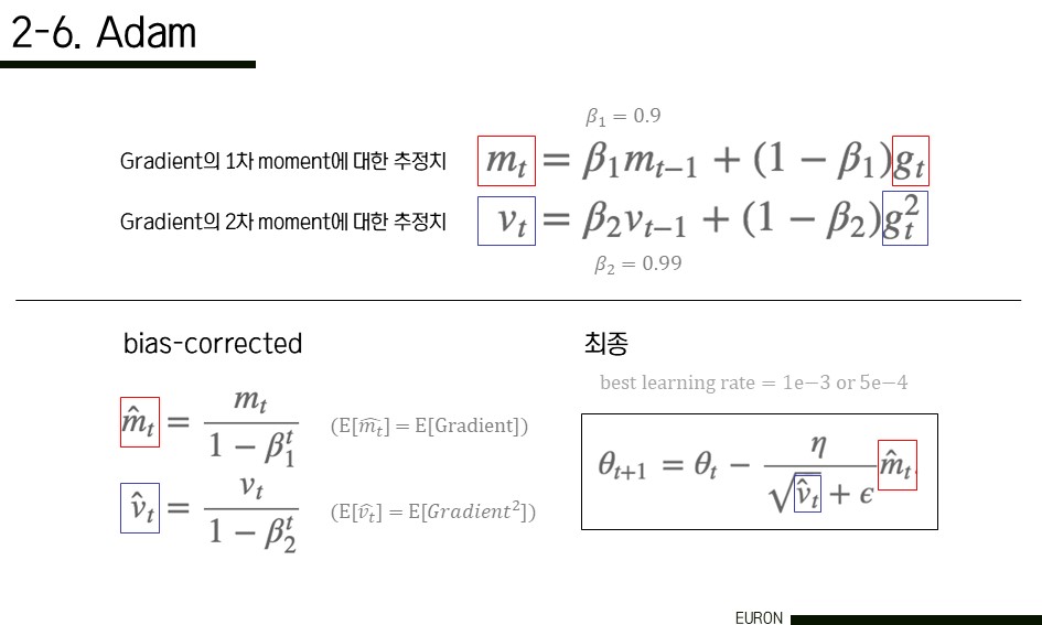 그 유명한(!) Adam이 됩니다. 앞서 등장한 두 갈래의 옵티마이저들의 집합체이며, 가장 흔하게 이용되는 옵티마이저입니다. 방향을 중심으로 한 Momentum 계열과 보폭을 중심으로 한 Ada계열이 합쳐져, 보폭도, 방향도 적절하게 조절하는 옵티마이저가 등장했습니다.