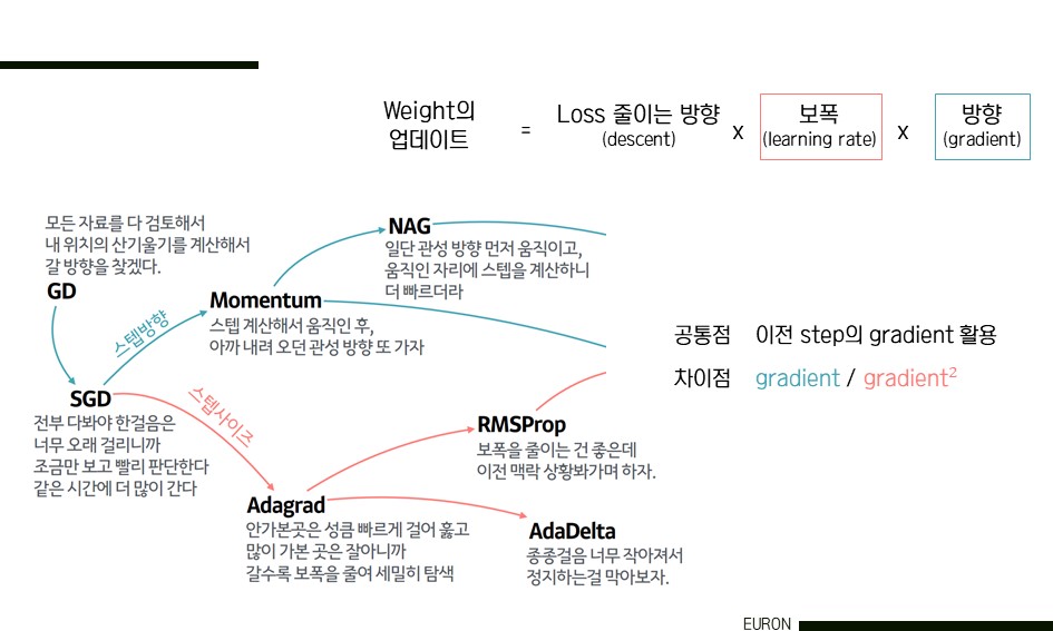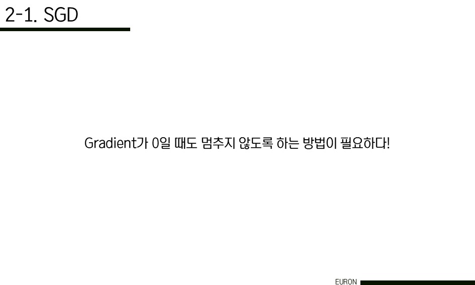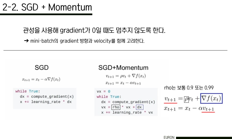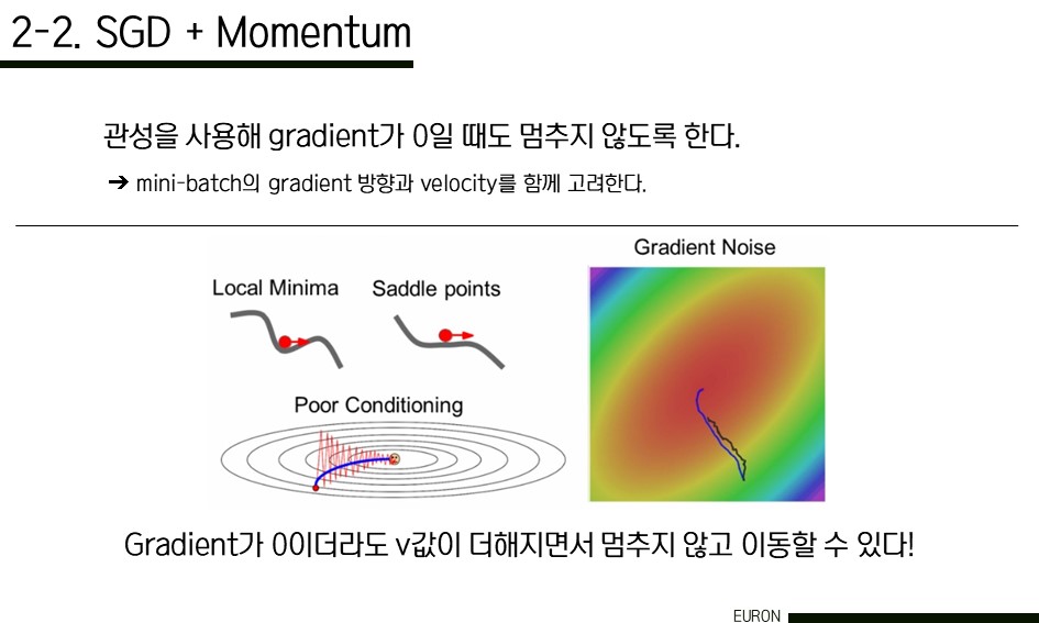 즉, 기울기가 0인 지점이 나와도, 멈추지 않도록 하는 것이 필요합니다. 이 문제를 해결하기 위해 다양한 옵티마이저들이 고안되었는데요. 지금부터 하나씩 알아보도록 하겠습니다.