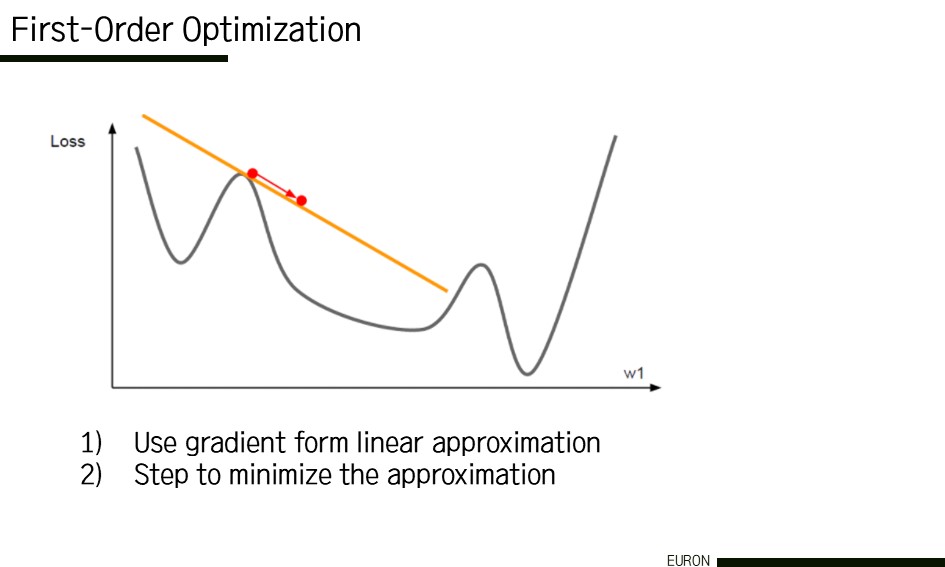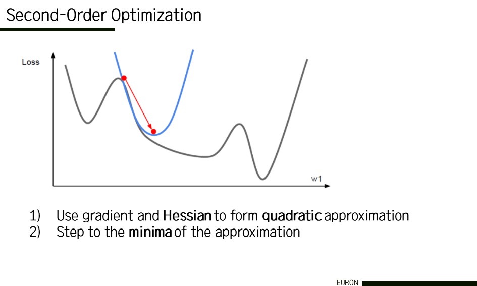 지금까지 우리가 봤던 것들은 대부분 first-order optimization에 속합니다! 지금 그림에 보이는 것처럼 선형 gradient를 이용해서 다음에 어떻게 움직일지를 최적화하는 것을 first-order optimization이라 합니다.