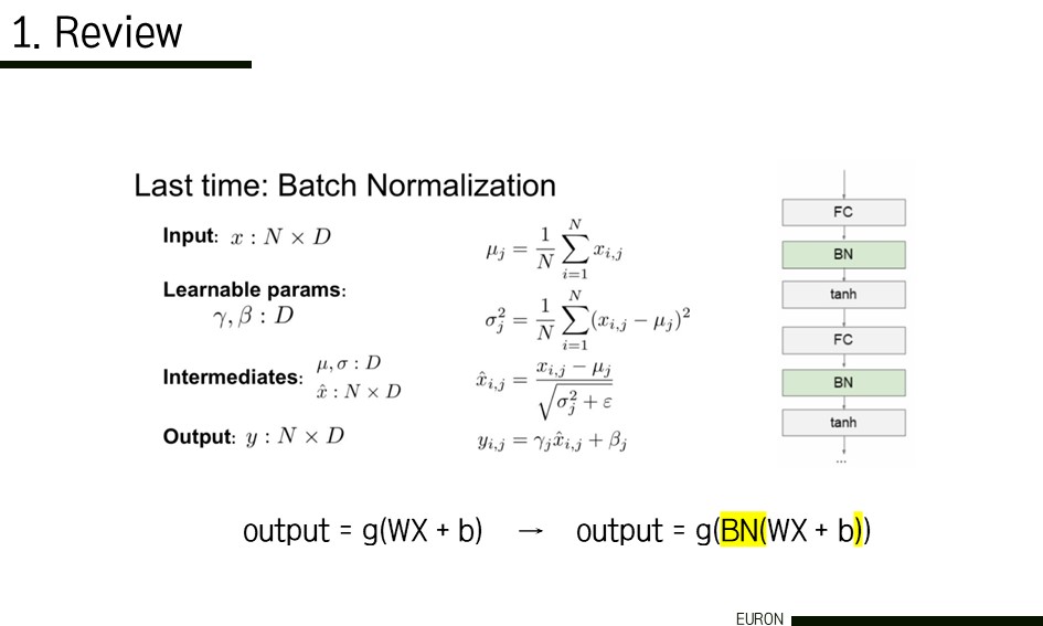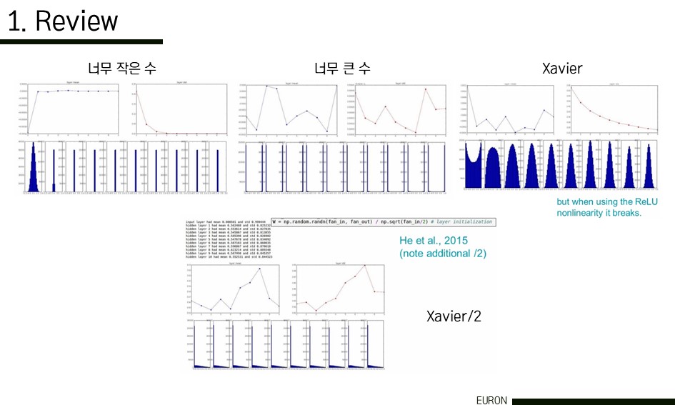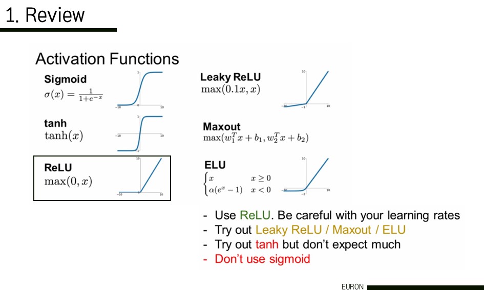 지난 시간 리뷰입니다. 다양한 activation functions에 대해서 배웠는데요. sigmoid에서 gradient가 0이 되거나, saturation과 같은 문제점이 발생했고, 그에 대한 해결 방법으로 어떤 함수들을 사용하게 되었는지에 대해서 쭉 배웠습니다. 그리고 웬만한 케이스에는 ReLU를 사용하는 게 좋다는 것을 알 수 있었고요.