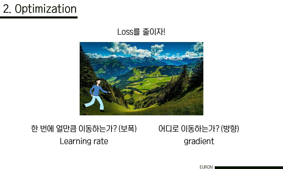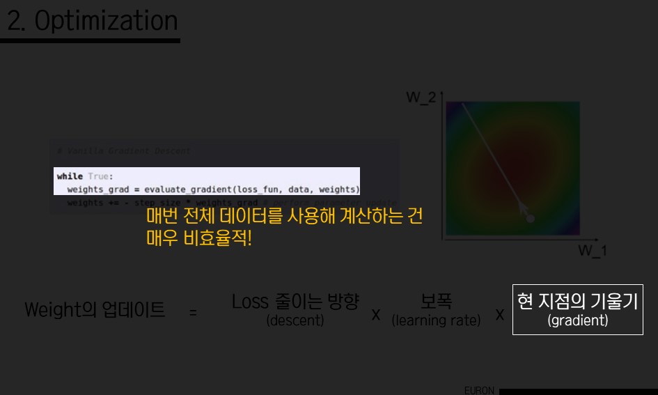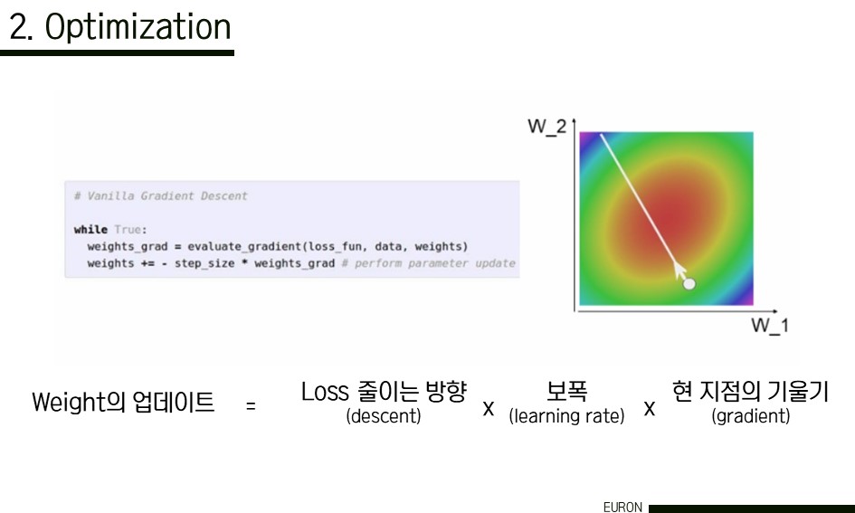 이 최적화 과정은 기본적으로 손실함수를 차근차근 줄이는 방향으로 내려가는 Gradient Descent 알고리즘으로 정의됩니다. 현재 가진 weight 세팅(내 자리)에서 내가 가진 데이터를 다 넣으면 전체 에러가 계산이 되고, 거기서 미분하면 에러를 줄이는 방향을 알 수 있다는 거죠. 그래서 에러를 낮추는 방향으로 가중치를 변경해야 되기 때문에 negative한, 즉 음수 방향으로 정해진 learning rate를 곱해서 weight를 이동시키게 됩니다.