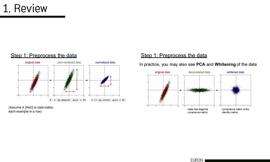 모든 특징들이 동일한 범위에 있도록 데이터를 정규화해서, 그 특징들이 결과에 동등하게 기여할 수 있도록 하기 위해 데이터 전처리 과정이 필요하다는 것도 배웠습니다. 이미지의 경우에는 zero-centered처리만 주로 하고, 평균차감, 정규화, PCA와 Whitening 등의 방법이 있었어요.