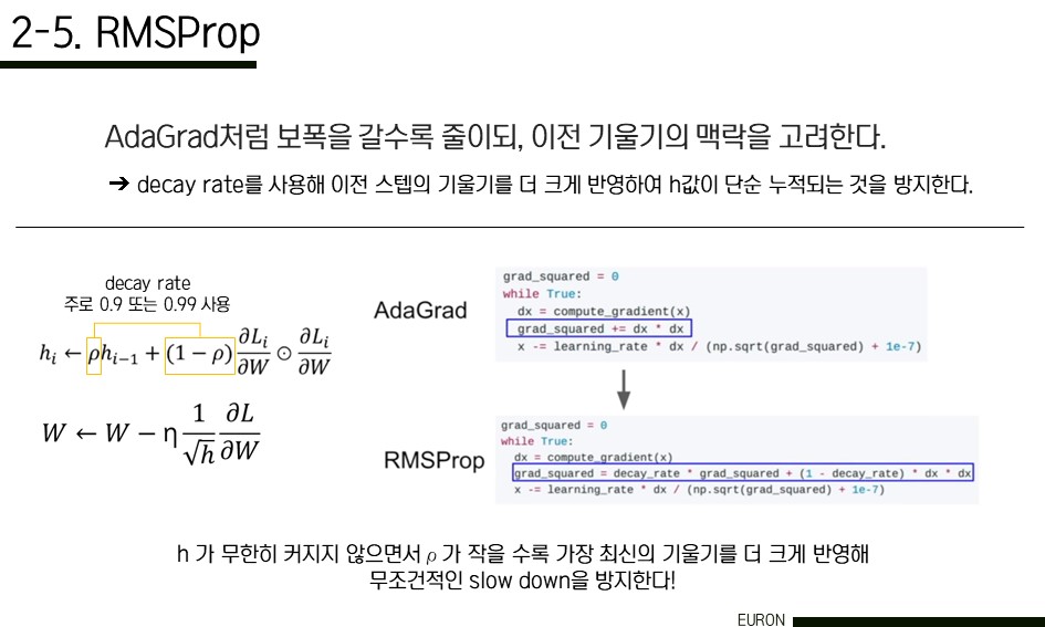 그 다음으로는 learning rate, 즉 스텝 사이즈를 조절하는 방법들이 있었습니다. Adagrad 같은 경우에는 변화가 많이 일어났을 수록 learning rate를 줄이고 변화가 적게 일어났다면 learning rate를 키우는 방식으로 탐색을 했고, 여기서 이 제곱합들이 계속해서 축적되는 바람에 분모가 커져서 gradient가 0에 가까워지는 문제가 발생하자, 이전 기울기를 더 크게 반영해 맥락을 고려해서 learning rate를 줄이는 RMSProp가 등장했습니다.