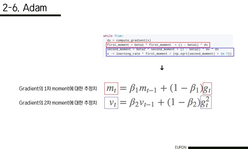 코드와 동일한 내용을 수식으로 바꿔 표현한 것인데요. 이 식을 보면 우리는 이러한 사실들을 알 수 있습니다. 첫째로, Mt의 식에서 빨간색 박스 속 gt를 보니 이것은 gradient를 중심으로 하는 모멘텀 계열이라는 것을 알 수 있어요. 둘째로, 그 아래 파란색 박스 속 gt^2를 보니 vt는 gradient 제곱에 반비례하는 ada, rmsprop 계열이라는 것을 알 수 있죠. 마지막으로 mt와 vt모두 rmsprop 슬라이드에서 봤던 decay rate가 포함된 가중평균식과 비슷하다는 것을 알 수 있습니다. 그럼 여기서 저 1차 2차 moment가 무엇일까요?