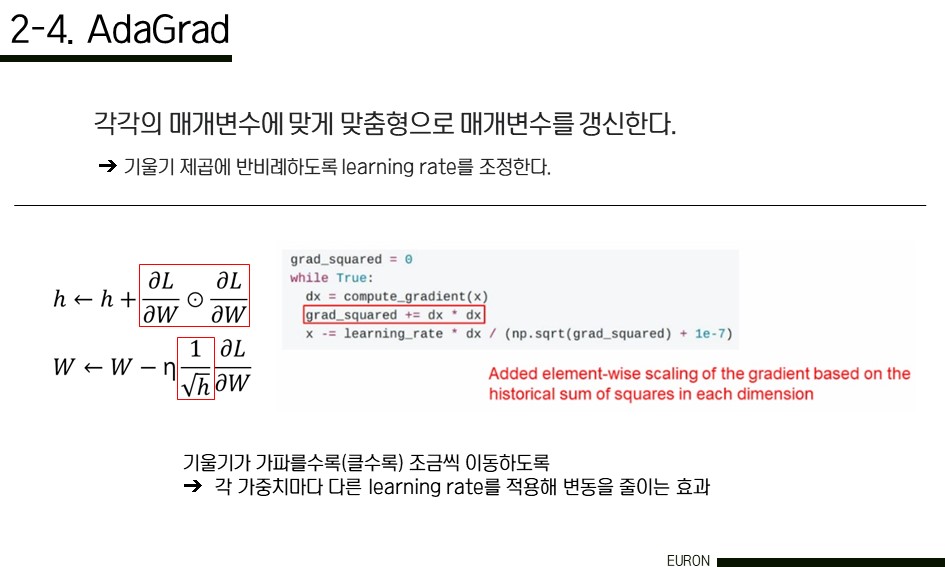 AdaGrad는 각각의 매개변수에 맞게 맞춤형으로 매개변수를 갱신하는 알고리즘입니다. 적응적으로 학습률을 조정하는 건데요. 기울기 제곱에 반비례하도록 학습률을 조정하는데, 이는 기울기가 가파를수록 조금만 이동하고, 완만할 수록 더 이동하게 함으로써 변동을 줄이는 효과가 있습니다. 무엇보다 가중치마다 다른 학습률을 적용한다는 점에서 더욱 정교한 최적화가 가능해집니다. 코드를 보시면 각 차원의 과거의 제곱 합을 기반으로 해서 각 파라미터들을 고려해 gradient의 scale을 조정한 값을 더해가는 방법이라는 걸 알 수 있어요.