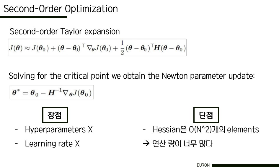 또 다른 방식으로 second-order optimization 방식이 있습니다. gradient와 hessian을 사용해서 2차 추정을 하는 방식입니다. 그림에서 보이는 빨간 화살표처럼 바로 최솟값을 찾아 이동을 할 수 있다는 장점이 있습니다. 이 부분만 보면 second-order optimization을 쓰는 게 더 좋아보입니다. 하지만 역시 장단점이 있는데요.