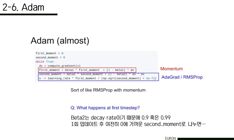 먼저 Second_moment를 0으로 초기화한 상태입니다. 이제 한 번의 업데이트를 진행하고 나면, beta2(second_moment의 decay rate)가 0.9 또는 0.99와 같이 1에 매우 가깝게 됩니다. 또 한 번의 업데이트 후에도 second_moment는 여전히 0에 가깝습니다. 자 이제 여기에서 learning rate를 second_moment로 나누면 아주 작은 수로 나누게 되는 거겠죠. 그럼 learning rate가 엄청나게 커질 수 있고, 이렇게 큰 learning rate는 잘못된 방향으로 학습하게 될 가능성이 큽니다.