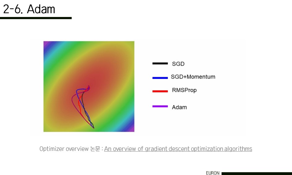 다른 optimizer와 비교한 그림입니다. 아담 또한 rsmprop의 특징을 가지고 있기 때문에 그래프 모양이 비슷하신 걸 확인하실 수 있어요. 만약 앞서 설명드린 식 전개 과정이나, 아담에 대해 더 알아보고 싶으신 분은 이 링크로 들어가셔서 논문을 참고해보셔도 좋을 것 같습니다.