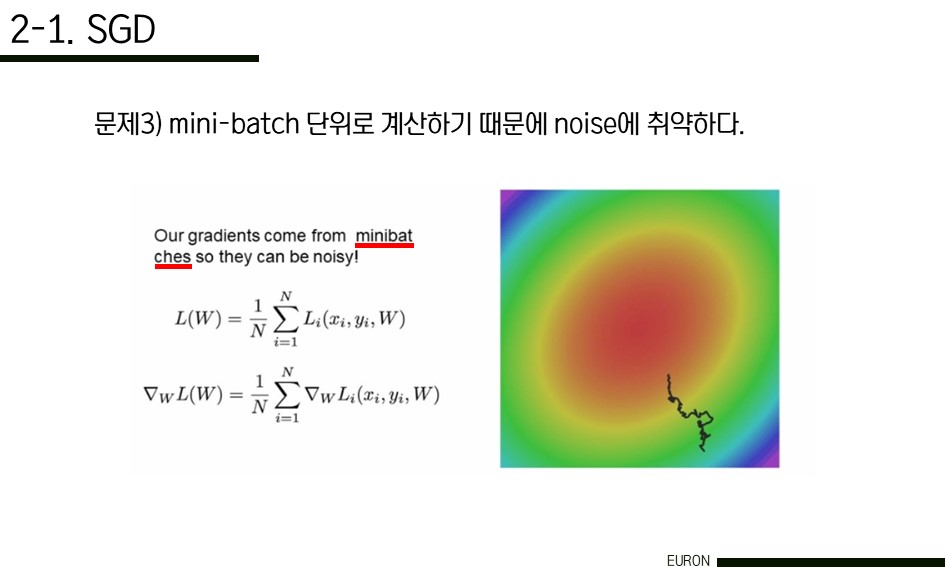 마지막으로, mini-batch를 사용하기 때문에 step마다 정확한 gradient를 담을 수 없습니다. 일부 data를 추출해서 학습을 진행하는 것이기 때문에, gradient를 측정할 때 noise가 있으면 SGD가 최소값에 도달하는데 더 오래 걸릴 수도 있겠죠. 오른쪽 그림을 보시면 일부러 noise를 준 상황입니다. 열심히 헤매고 있는 것을 볼 수 있어요.