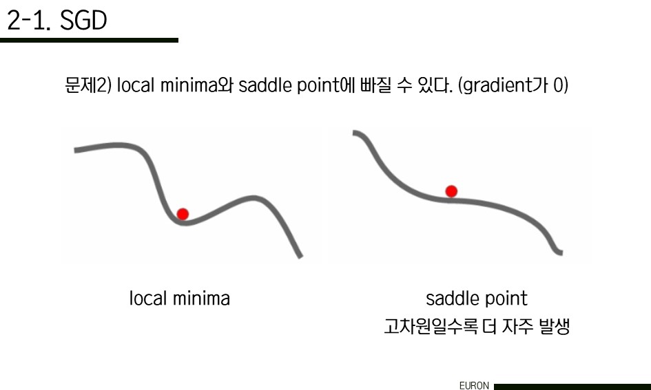 다음으로, 이러한 골짜기가 있는 loss function에서 SGD는 local minima와 saddle point에 빠질 수 있다는 치명적인 단점이 있습니다. Local minima의 경우 기울기가 0이 되어버리기 때문에 찾았다고 착각하고 멈춰버리게 됩니다. Saddle point 근처에서도 gradient가 0에 가까워지는 상황이 발생하고, gradient가 매우 작은 값이라 정말 학습이 느리게 진행되는 문제가 발생할 수 있습니다. 고차원에서는 local minima보다 saddle points가 더 자주 발생하게 됩니다. 왜냐하면 parameter가 1억개가 된다고 해보면, 현재 포인트에서 일부 방향은 손실이 증가하고 일부 방향은 손실이 감소하는 상황이 거의 모든 곳에서 발생할테니까요.