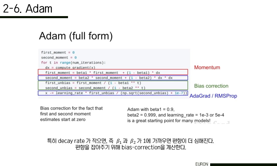 코드를 보면서 아담을 한번 살펴보겠습니다. 먼저 아직 완벽한 아담은 아니고 아담과 가장 비슷한 형태의 optimizer인데요. Momentum 계열과 ada 계열의 두 가지 특징을 어떤 면에서 다 가지고 있다고 하는 건지에 집중해서 보시면 좋을 것 같아요.