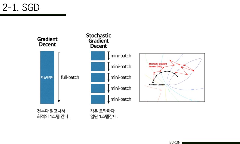 Stochastic Gradient Decent의 약자인데요. 완벽한 대신 느린 것보다, 조금 훑어보고 일단 빨리 가자는 목적을 가지고 있습니다. GD가 한 번 학습할 때 모든 data에 대해 계산을 한 후 가장 최적화된 한 스텝을 걷는다면, SGD는 일부, 즉 mini-batch 단위로 검토를 한 후 일단 발을 내딛어보는 거라고 할 수 있어요.