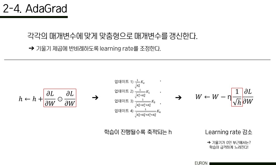지금까지 논의된 방법들은 모두 모든 파라미터에 똑같은 learning rate를 적용했는데요. 다음은 업데이트 횟수에 따라 learning rate를 조절하는 방식에 대해서 알아보겠습니다. Learning rate를 조절하는 건 굉장히 계산이 많은 작업이라 데이터에 맞춰서, 적응적으로 학습 속도를 정하는 방법을 찾고자 많이 노력했어요. 지금부터 살펴볼 AdaGrad도 데이터에 맞게 학습 속도를 조정하는 방법 중 하나입니다.