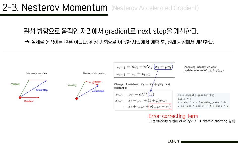 화살표를 따라 변형된 식을 정리해보면 아래와 같이 나오는데, 이빨간 부분을 error-correcting term이라고 합니다. 이는 이전 이전 velocity와 현재 velocity의 차이를 반영하여 급격한 슈팅을 방지한다는 측면에서 효과가 있고, 더 빠른 학습을 가능하게 한다고 합니다. 이 수식을 코드로 옮겨놓은 것이 오른쪽입니다. 하나씩 대조해서 보시면 쉽게 이해가 되실 거예요.