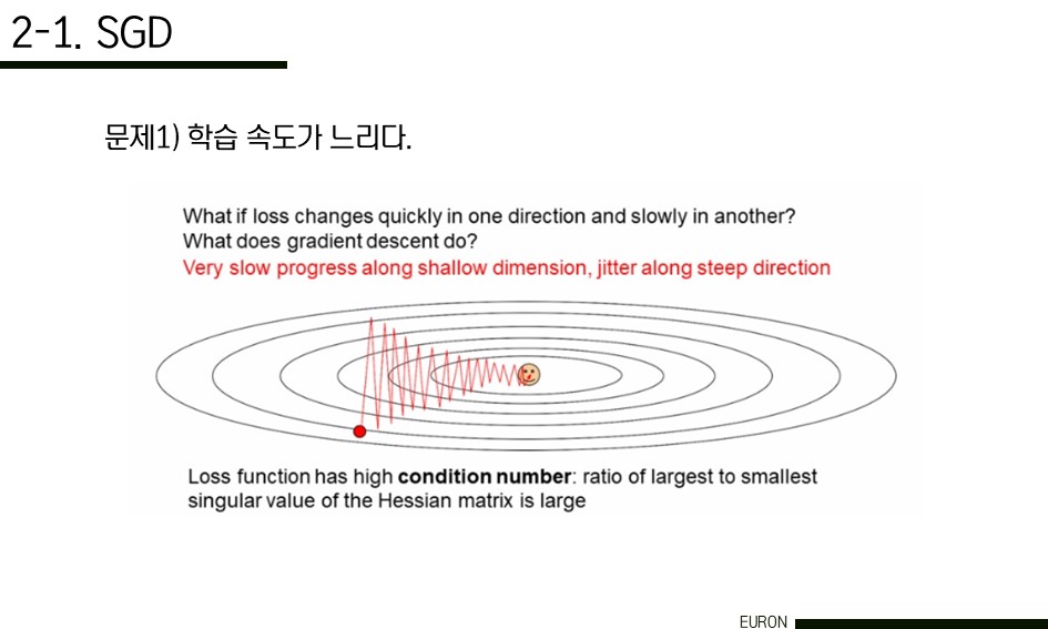 SGD는 전체 학습데이터에서 하나씩 랜덤으로 뽑아 학습을 진행하는데요, batch_size만큼의 데이터를 랜덤으로 뽑아 한 회 학습에 이용하는 Mini-batch Gradient Descent도 있습니다. 어쨌거나 이렇게 적은 양의 데이터를 추출해 학습하게 되면 GD보다 훨씬 빠르게 업데이트가 진행된다는 장점이 있어요. 그런데 이 방법은 실제 학습에서는 문제가 많이 발생합니다.