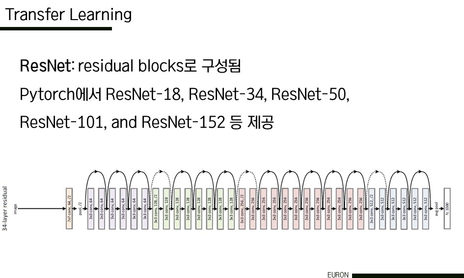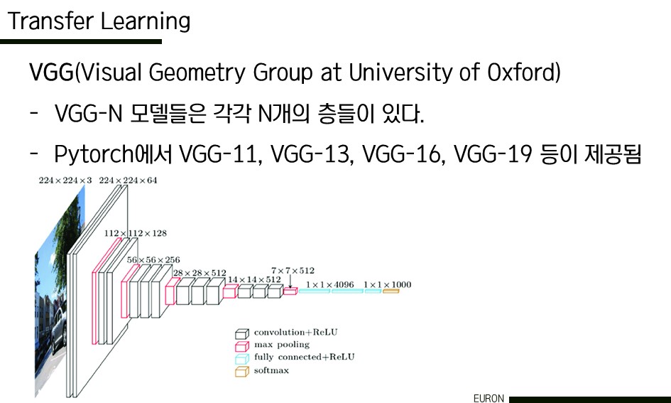 먼저 왼쪽은 ResNet이다. residual block들로 구성이 되어 있고 pytorch에서 기본적으로 여러 레이어들을 갖는 resnet 모델이 제공이 된다. 오른쪽은 VGG이다. 이 역시 n개의 층을 가진 vgg-11, vgg-13 등등 다양한 모델이 학습된 상태로 pytorch에서 제공이 되고 있다. 이외에도 GoogLeNet, AlexNet, SqueezeNet, DenseNet, ShuffleNetv2 등등 다양한 모델을 활용할 수 있다. 지금은 모두에게 공개되어 있는 큰 데이터 셋이 많기 때문에, transfer learning을 통해서 여러 가지를 시도해볼 수 있을 것이다.
