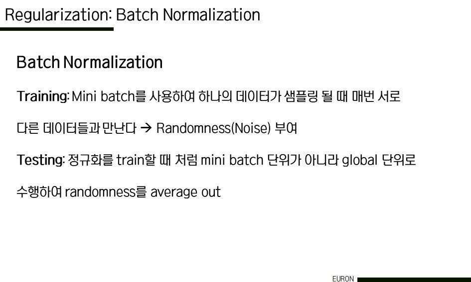 다른 regularization 방식으로 batch normalization이 있다. 이는 mini batch를 사용하는 방식인데 하나의 데이터를 매번 다른 데이터들과 조합해서 랜덤성을 부여하는 방식이다. 마찬가지로 테스트를 할 때는 매번 랜덤하게 결과를 도출하면 안 되기 때문에, 테스트를 할 때는 mini batch를 사용하지 않고 글로벌하게 수행을 해서 이때 생긴 randomness를 average-out 시켜준다.