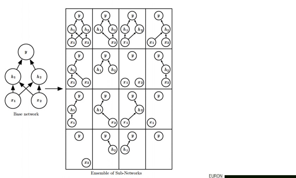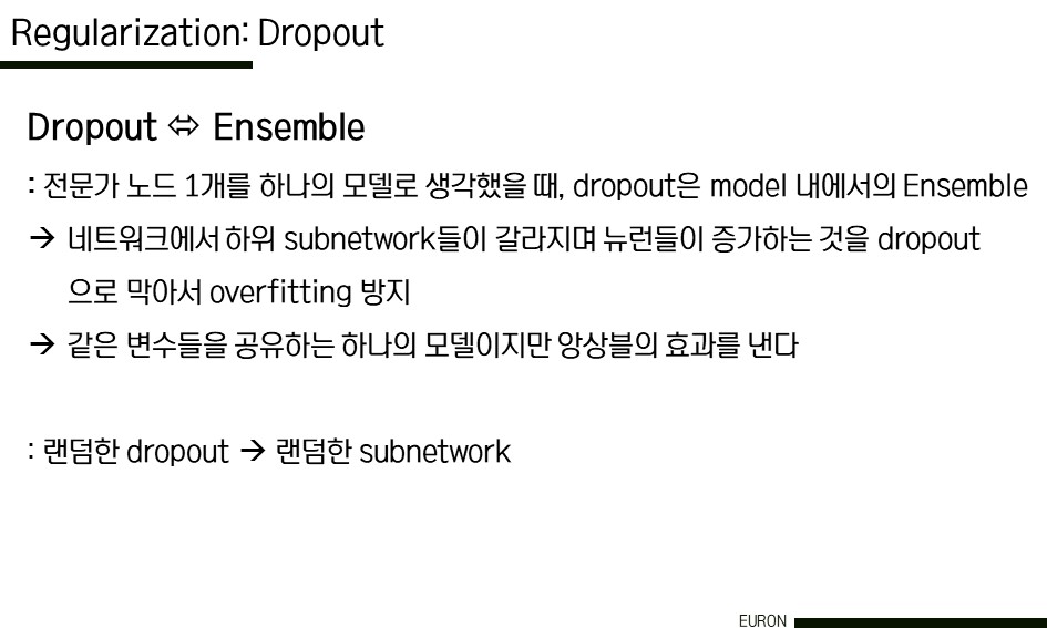 이러한 dropout 방식은 앞서 말했던 모델 앙상블의 일종으로도 이해할 수 있다. 노드 하나를 하나의 모델로 생각해보면, dropout은 일종의 모델 내에서의 앙상블이라고 이해할 수 있다. 하나의 모델에서 랜덤한 dropout을 통해서 랜덤한 서브 네트워크가 형성되면서 앙상블의 효과를 낼 수 있기 때문이다. 오른쪽 그림을 보자. 왼쪽의 베이스 네트워크를 여러 가지 방식으로 dropout 하면서 변조를 줌으로써, 오른쪽 표처럼 다양한 서브 네트워크가 생기게 되고, 이러한 것들이 앙상블의 효과를 내면서 overfitting을 감소시킬 수 있게 되는 것이다.