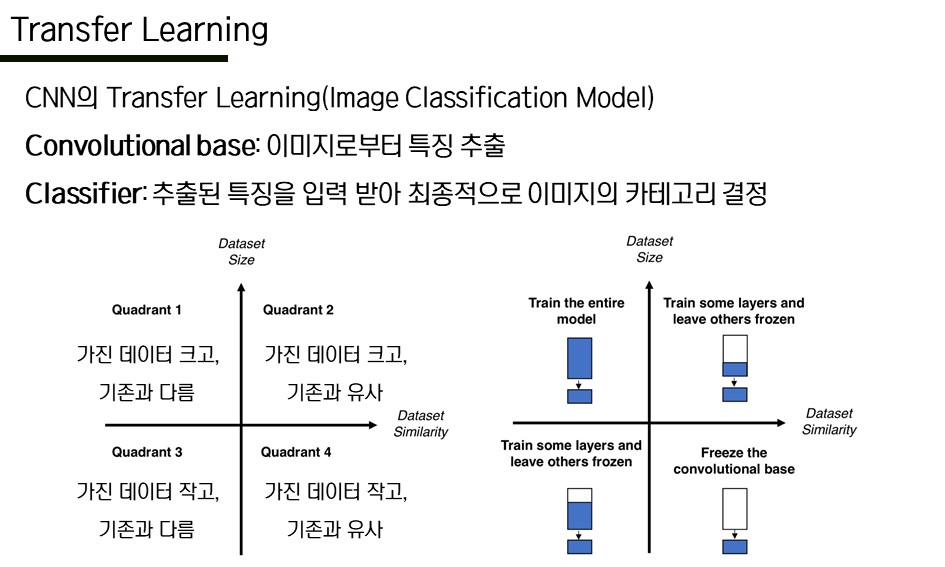 Quadrant 4 가진 데이터가 작고 기존과 유사할 경우 convolutional base는 그대로 얼려두고 마지막 classifier 부분에서만 새로운 데이터로 학습을 시켜주면 좋은 결과를 얻을 수 있을 것이다. |