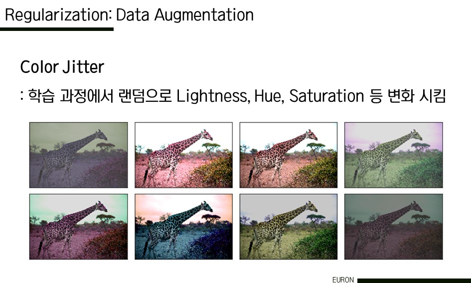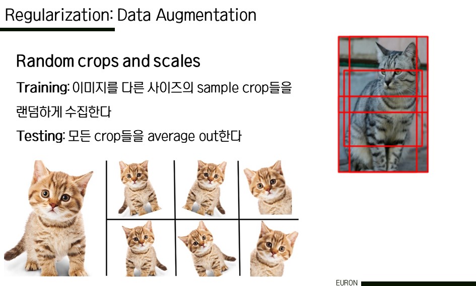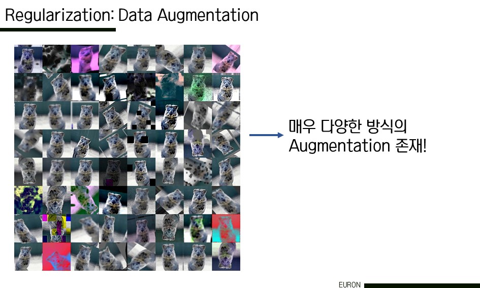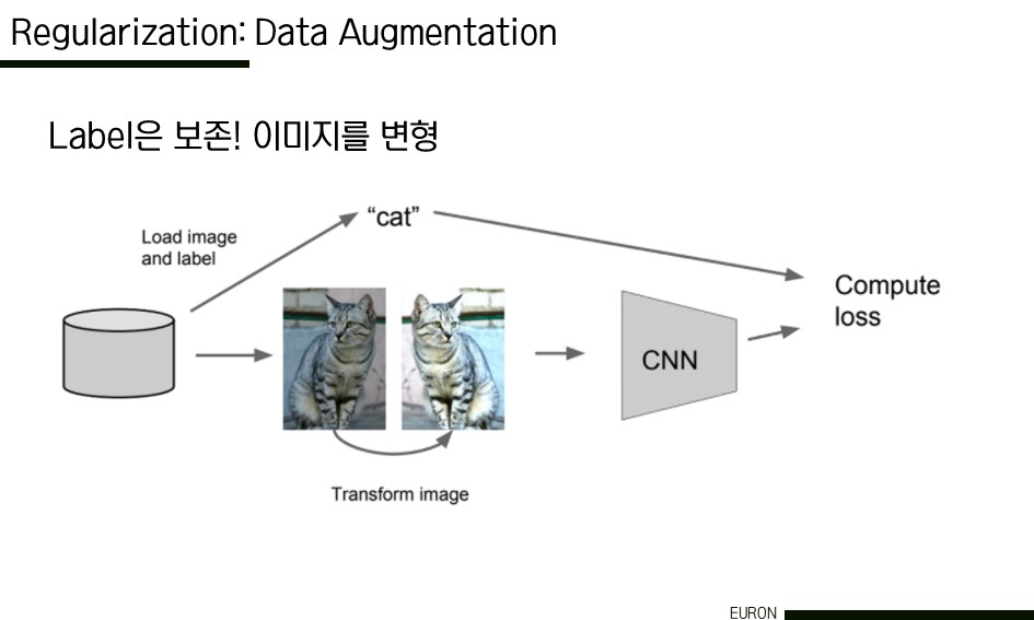 다음으로는 data augmentation이 있다. 이는 training set과 test set 사이에 괴리감이 있을 때 사용되는 방식이다. 이미지에 임의의 잡음이나 translation을 가해서 괴리감을 줄이고, 성능을 향상시켜준다. 하나의 이미지를 여러 가지 방식으로 변조하기 때문에 기존 데이터의 크기가 작은 경우에 데이터 셋을 늘려주는 효과도 있다. 오른쪽 그림처럼 라벨은 그대로 보존을 하고 이미지만 여러 방식으로 변형을 해서 데이터를 증강시켜주는 방식이다.