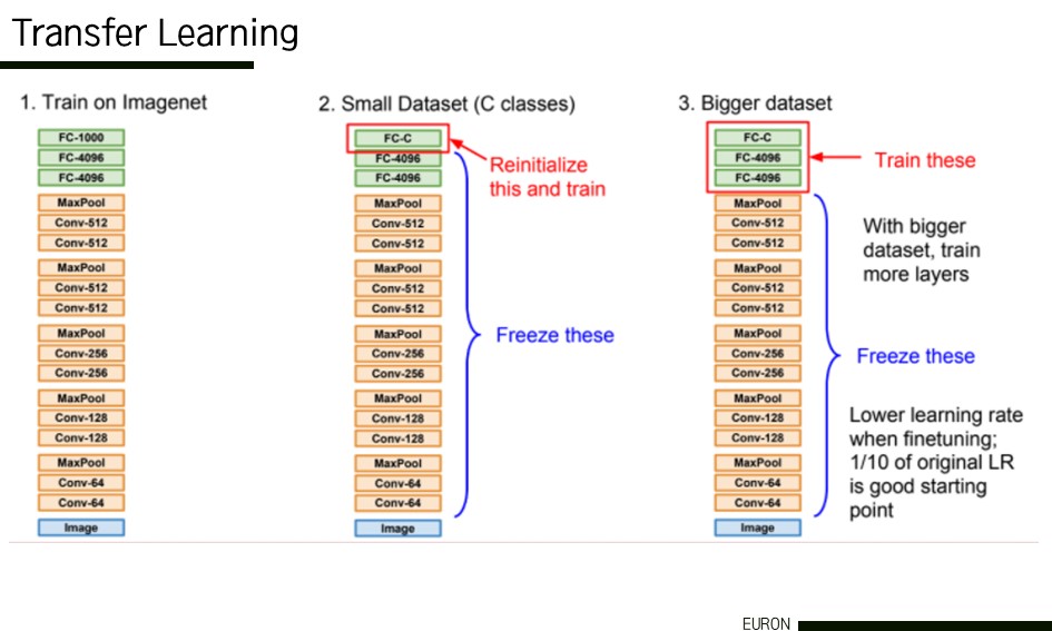 (2) 사용하고자 하는 데이터 셋이 굉장히 작을 경우, 아래 레이어들은 전부 얼려주고(freeze), 마지막 부분의 레이어만 다시 초기화하고 학습해서 우리가 원하는 데이터 셋을 적용시켜준다.