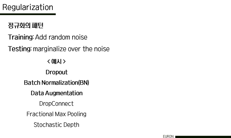 정규화는 이러한 방식으로 보통 진행되며, 가장 많이 사용되는 방식은 batch regularization이나, augmentation, 그리고 dropout 등등이라고 한다.