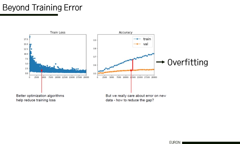 위의 그래프는 훈련에 대한 정확도는 높고, 검증(실제 테스트)에 대한 정확도가 낮은 것을 의미한다. 이를 오버피팅(overfitting)이라고 하는데, 이 상황을 개선하기 위해 사용하는 여러 방법들을 지금부터 알아볼 것이다.