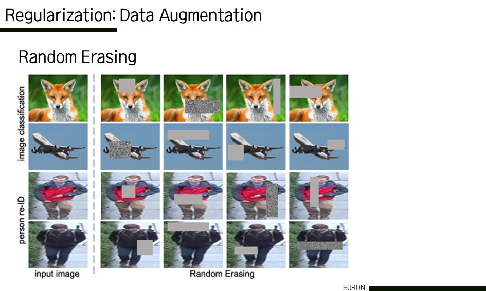 또 다른 augmentation 방식으로 random erasing 방식이 있다. 그림처럼 이미지의 랜덤한 부분을 noise로 없애는 방식이다. 그 외에도 오른쪽 그림처럼 수 없이 다양한 방식의 augmentation이 존재하고, 이는 실제로 대부분의 모델을 학습할 때 매우 보편적으로 사용이 되는 방식들이다.