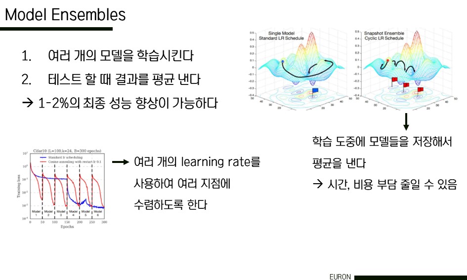 먼저 살펴볼 방법은 모델 앙상블 방식이다. 모델 앙상블 방식이란, 여러 개의 모델을 학습시키고, 테스트 시 이 결과들을 평균을 내서 사용함으로써 최종 성능을 향상시킬 수 있는 방식이다. 그러나 매번 여러 개의 모델을 학습시키는 것은 시간/비용적 부담이 있기 때문에 상단 그림처럼 학습 중간 중간에 여러 번 저장을 해서(그림에는 깃발로 표시되어 있다.) 그것을 각각의 모델처럼 취급하는 방법이 사용되기도 한다. 또한, 하단 그래프처럼 여러 개의 learning rate를 사용해서 여러 지점에 수렴하도록 할 수도 있다.