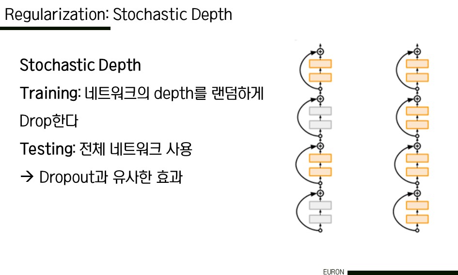 마지막으로 stochastic depth 방식이다. 왼쪽 그림이 training 할 때의 그림이고, 오른쪽이 test 할 때의 그림이다. training을 할 때는 왼쪽처럼 네트워크의 depth를 랜덤하게 drop해주고, test를 할 때는 drop하지 않고 전체 네트워크를 사용한다. 이 방식은 dropout과 유사한 효과를 낸다.