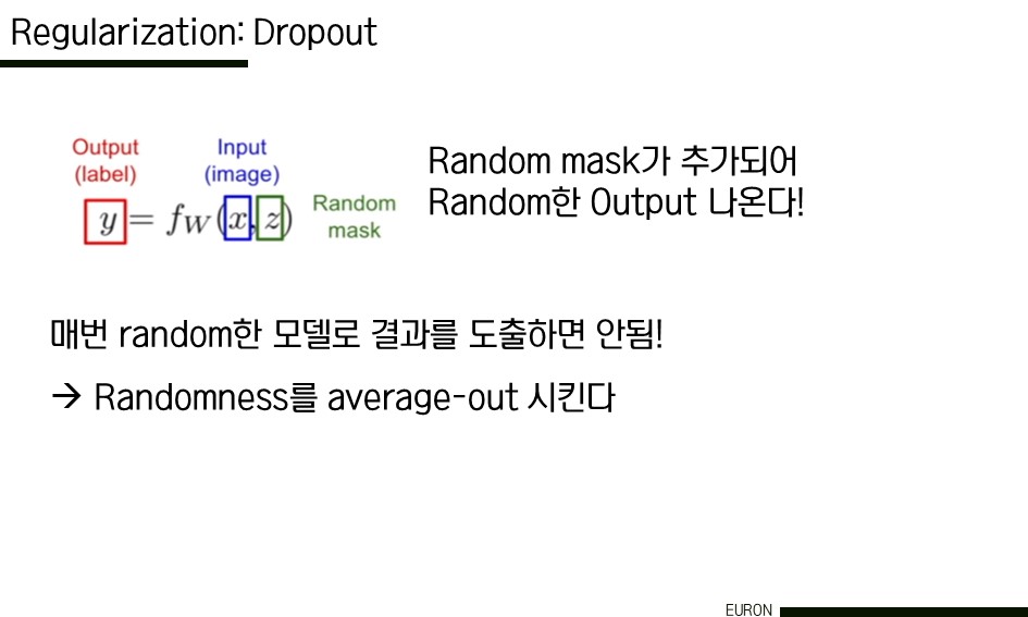 수식으로 살펴보자. 인풋에서 아웃풋을 계산할 때 추가적으로 랜덤한 마스크가 추가된다. 그래서 이때 랜덤한 아웃풋이 도출되는데, 테스트를 할 때는 이렇게 매번 랜덤한 모델로 결과를 도출하면 안 된다. 그렇기 때문에 이렇게 부여된 랜덤니스를 average-out할 수 있는 방법이 필요하다.
