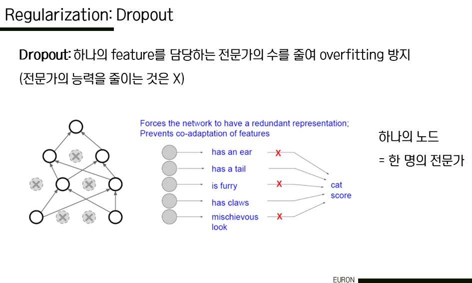 이렇게 랜덤으로 activation 값을 0으로 '꺼버린다'는 것이 어떤 의미인지 궁금할 수 있다. 이 부분에 대해서 CS231n 강의에서의 설명을 빌려보자면, '사공이 많으면 배가 산으로 간다.'가 적용된 방법이라고 할 수 있다. 그림의 뉴런에서 하나의 노드를 '하나의 feature에 대한 1명의 전문가'라고 해보자. 하나의 벡터에 대해 너무 많은 전문가들이 있는 것은 성능 향상에 큰 도움이 되지 않기 때문에, 오히려 이런 전문가들의 수를 줄여서 feature가 co-adaptation 되는 것을 막아준다는 의미다. 이때 전문가의 능력이 떨어지는 것이 아니고, 하나의 feature에 대해서 과하게 많은 전문가가 있는 상황을 막아주는 방식이 dropout이다!