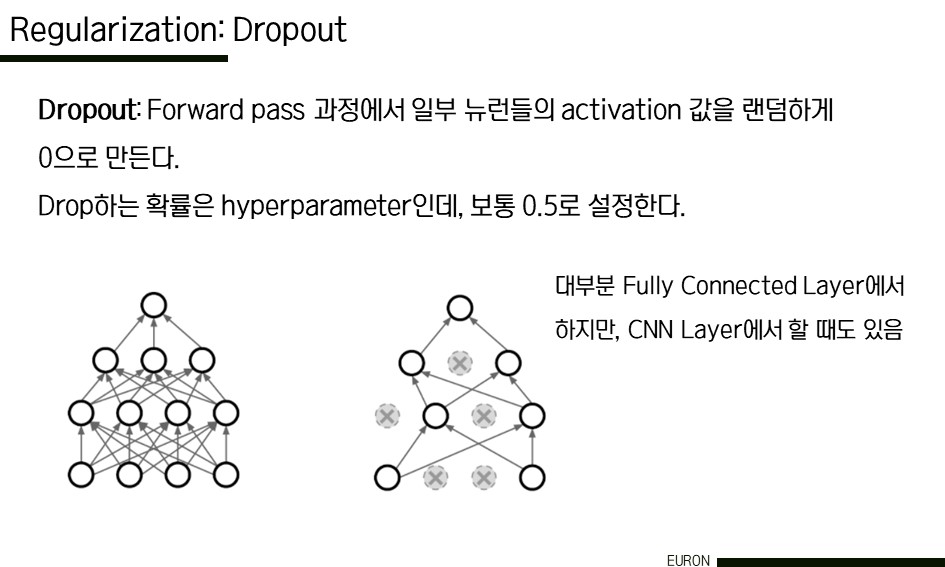 첫 번째로 dropout 방식이다. 상당히 직관적인 방식으로, forward pass 과정에서 일부 뉴런들의 activation 값을 랜덤하게 0으로 만들어버리는 방식이다. 이때 얼마나 drop할지는 hyperparameter로 우리가 직접 정해주게 되는데, 보통은 0.5로 설정한다. 이 방식은 fully-connected layer에서 주로 많이 사용되며, cnn layer에서도 사용된다.