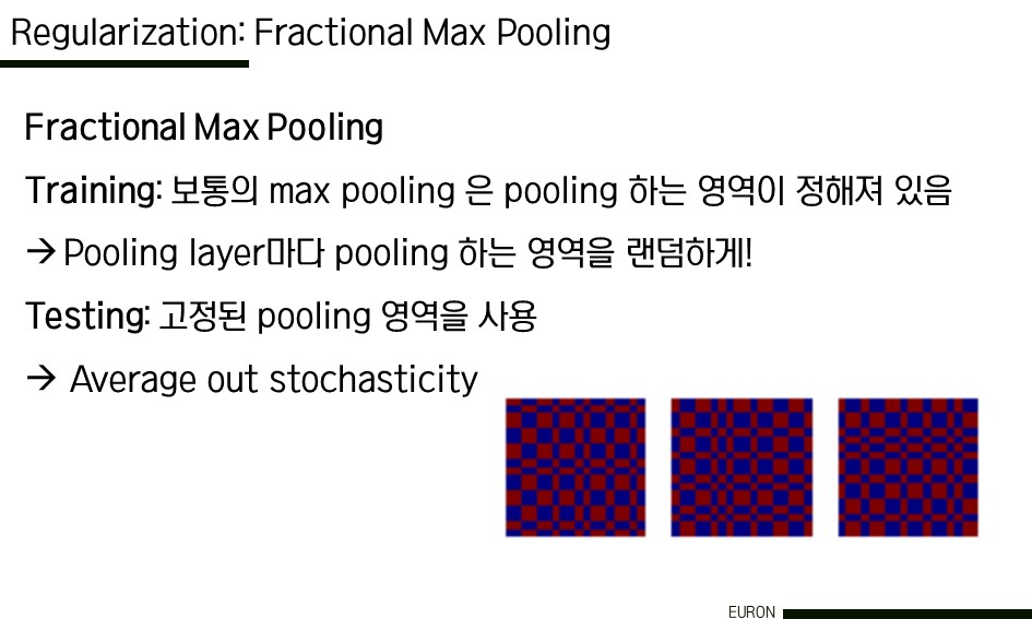 fractional max pooling이다. max pooling은 fully-connected layer를 배울 때 다룬 적이 있다! training을 할 때 보통의 maxpooling은 일정하게 정해진 영역을 pooling한다. 반면에 fractional max pooling은 pooling layer마다 pooling하는 영역을 그림처럼 랜덤하게 바꿔주면서 진행하게 된다. 이 방법을 통해 랜덤성이 부여가 되는데 테스트를 할 때는 고정된 pooling 영역을 사용해서 이 랜덤성을 average-out 시켜준다.