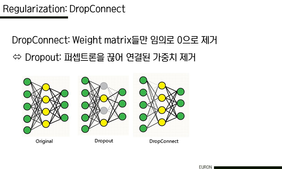 다음으로 살펴볼 dropconnect 방식은, 이름부터 dropout과 굉장히 비슷하다! dropout은 뉴런 자체를 끊어서(그림을 보면 dropout에 해당하는 노드 몇개가 랜덤으로 꺼져있는 상태인 것을 확인할 수 있다.) 연결된 가중치를 제거하는 방식이었다면, dropconnect는 연결된 부분의 가중치를 0으로 만들어서 별도로 0으로 만들어주는 방식이다.